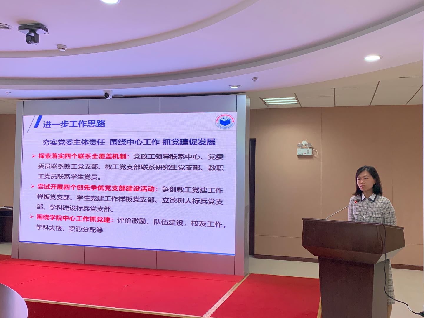党委书记李毅代表mg冰球突破试玩党委做了题为“夯实党委主体责任,围绕中心工作,抓党建促发展”的总结报告。首先她介绍了学院党建工作的总体情况和近期安排,带领大家一起学习习近平在全国教育大会上的讲话精神,她希望大家把思想政治工作贯穿教育教学全过程,同时严格落实党风廉政建设的要求,正风肃纪。最后她详细阐述了学院党建下步工作思路,她表示学院党委将进一步加强基层党组织建设,围绕学院中心工作,促进学院科学发展。