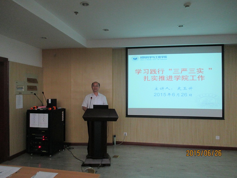 在报告的重点部分,史玉升书记以问题为导向,针对在党的群众路线教育实践活动中学院查摆出来的10方面问题以及学院在发展中遇到的困难,按照“三严三实”的要求提出了加强学科融合、加快学科建设,加强制度建设,加强基层党组织建设,推动院务公开和信息公开工作等一系列解决问题的思路。同时,史玉升书记也对全院教职工提出要求:严以修身,不断加强师德师风建设,爱岗敬业、以身作则、尊重和关爱每一位学生;严以律己,通过学习,提高认识,加强对科研经费的使用管理。